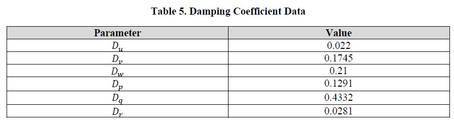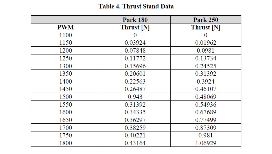The thrust coefficient matrix can be calculated directly from thrust stand data. In this test, a known PWM (pulse width modulation) signal is sent to the motor, which is attached to a stationary stand that measures the thrust force of the motor configuration. The current vehicle configuration uses a Park 180 motor for the left and right thrusters and a Park 250 motor for the up and down motors. A step test was performed for each motor in which the PWM signal was varied from 1100 to 1800 in increments of 50, and the resulting data is shown in Table 4 below.