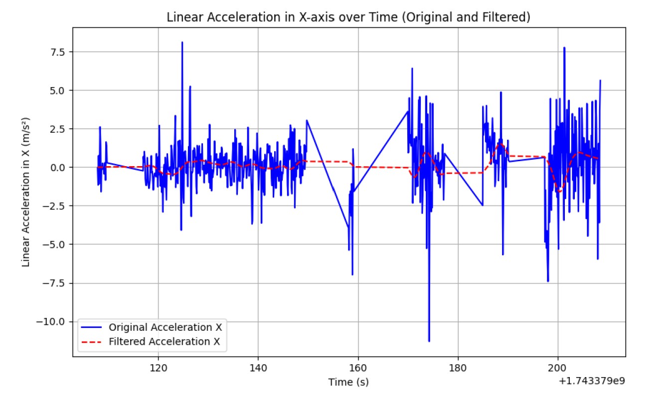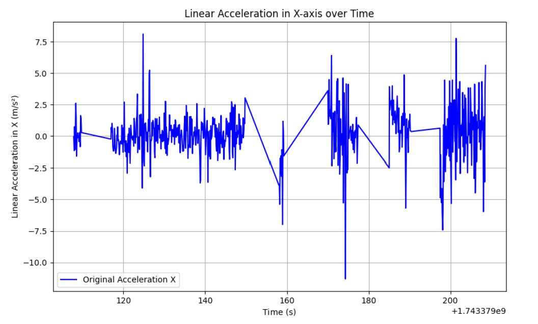 The linear acceleration in the X-axis was plotted against time, providing a clear representation of the motion profile over the recorded duration. We have Plotted the raw data using Matplotlib and labeled the axes for clarity.