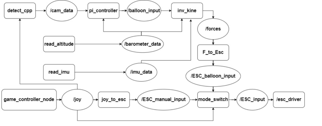 The mode_switch node selects between manual and autonomous control. It listens to /ESC_Manual_input, /ESC_balloon_input, and /joy, and publishes the final ESC command to /ESC_input. It is central to toggling between pilot input and autonomous operation during testing.
